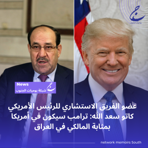 أخبار العراق عضو الفريق الاستشاري للرئيس الأمريكي كاتو سعد الله: ترامب سيكون في أمريكا بمثابة المالكي في العراق بواسطة فهد ابراهيم البدري في فبراير 7, 2025 0 133 شارك 0 133 شارك FacebookTwitterGoogle+ReddItWhatsAppPinterestالبريد الإلكتروني