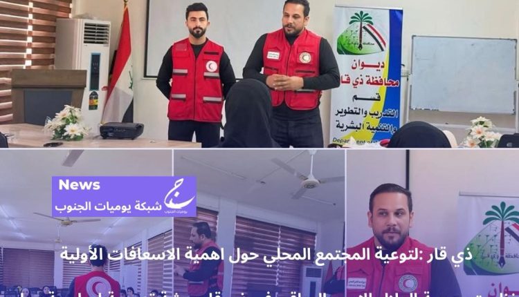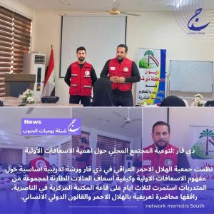 ذي قار :لتوعية المجتمع المحلي حول اهمية الاسعافات الأولية نظمت جمعية الهلال الاحمر العراقي في ذي قار ورشة تدريبية اساسية حول مفهوم الاسعافات الاولية وكيفية اسعاف الحالات الطارئة لمجموعة من المتدربات استمرت لثلاث ايام على قاعة المكتبة المركزية في الناصرية، رافقها محاضرة تعريفية بالهلال الاحمر والقانون الدولي الانساني.