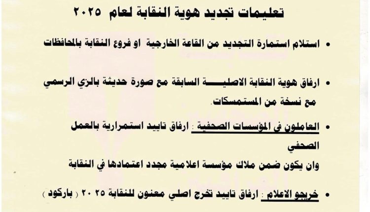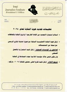 تعلن نقابة الصحفيين العراقيين المباشرة بتجديد هويات اعضاء النقابة لعام/ 2025 واعتباراً من يوم الثلاثاء 11/2/2025.